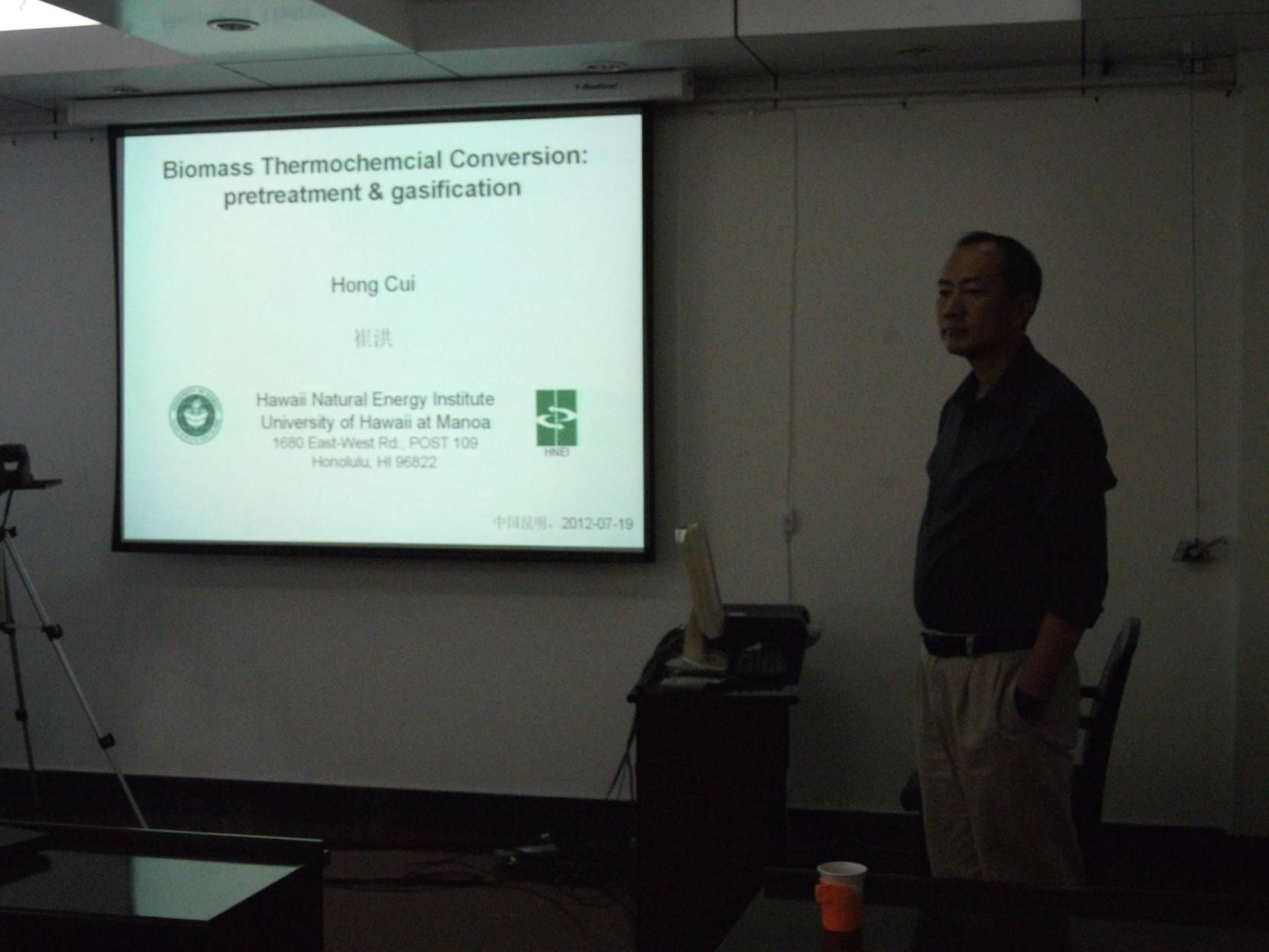 2012年7月18-19日,马来西亚国民大学谢振华博士及美国夏威夷大学崔洪博士等人参观我园生物能源组,并给生物能源组成员做了相关的学术报告。7月18日下午,谢博士首先介绍了马来西亚生物质资源,如棕榈、麻黄等,然后报告了近几年来谢博士所在研究组近几年来所致力于的研究工作、研究目标和取得的研究成果。研究成果如:酸(HCl和H2SO4)水解棕榈果壳纤维生产葡萄糖;酸水解麻黄木材生产纤维素和纳米纤维素;抗菌纤维素和壳聚糖小球负载银纳米颗粒及石墨氧化物的生产,等等。7月19日上午,崔博士围绕夏威夷优势生物质资源合欢、鼻草、甘蔗渣等展开了以生物质热化学转化为主题的学术报告,内容主要涉及生物质预处理,气化过程,净化过程(合成气成分分析,气态硫化物分析,焦油采集分析,NH3/Cl 采集分析,HCN采集分析,微量元素采集分析)。此外,两位博士耐心为课题组成员解疑答惑。