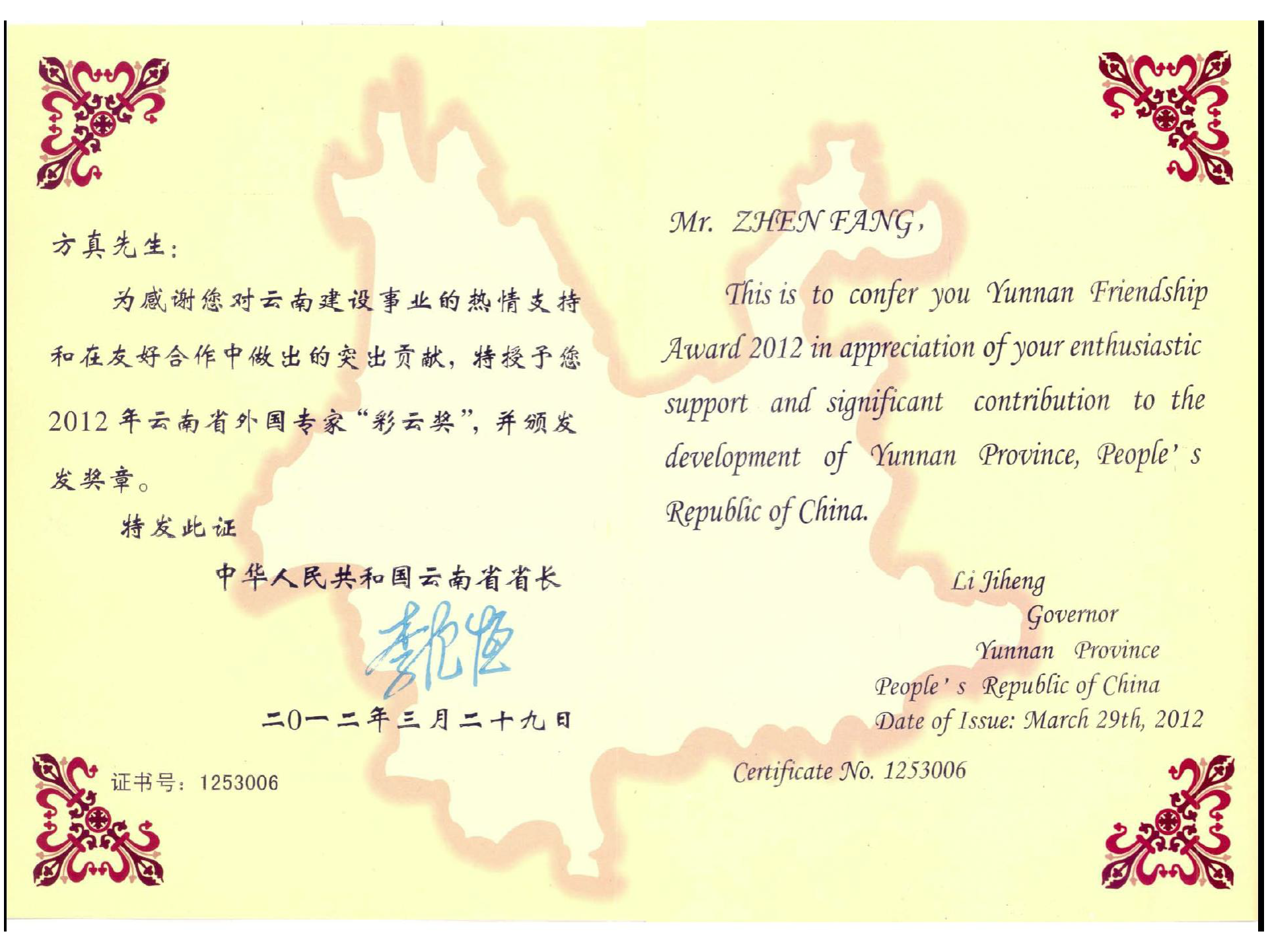 Prof. Zhen FANG won the Governor’s Friendship (Caiyun) Award in 2012 in Yunnan for the significant contribution to the Jatropha biodiesel industry and bioenergy.