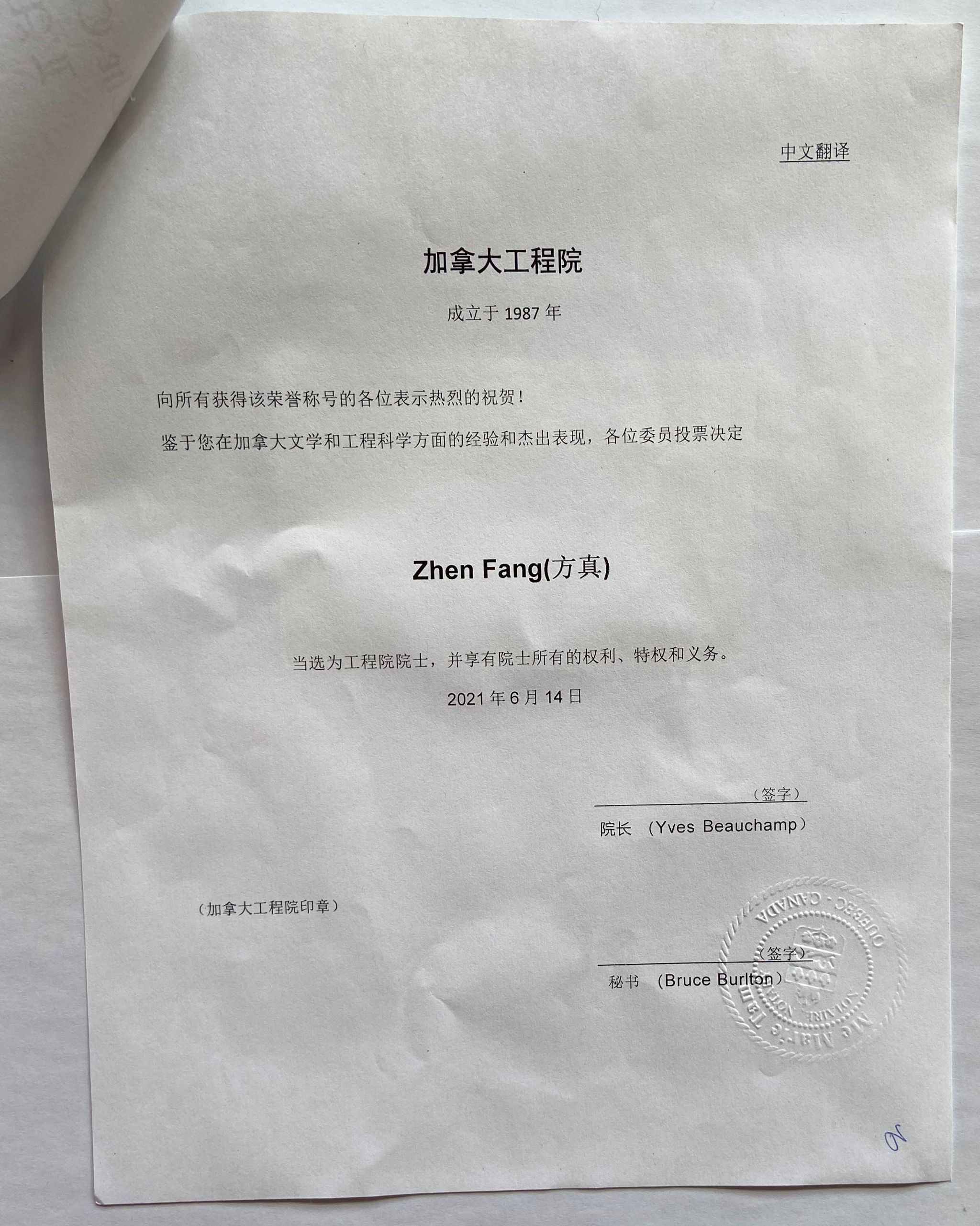 方真教授当选加拿大工程院院士Prof. Zhen Fang has been elected as 2021 Fellow of the Canadian Academy of Engineering (CAE)