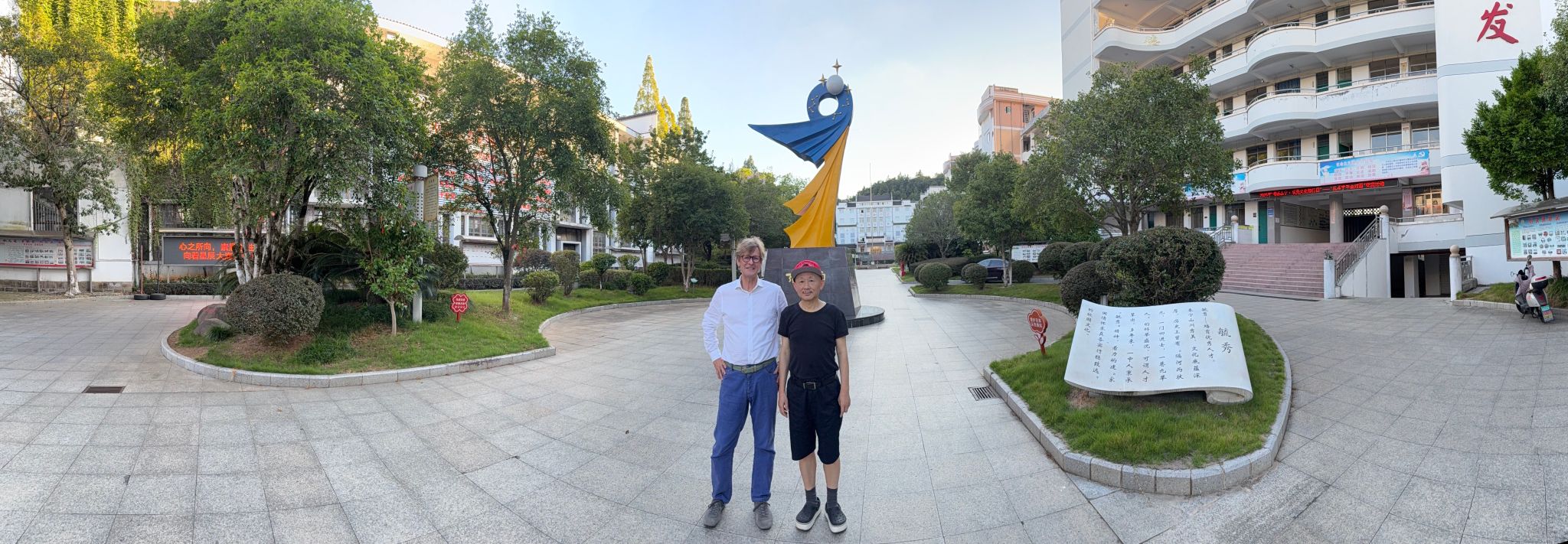 At 9:49 am on August 18, 2025, under a clear sky without a single cloud, Profs. Kozinski and Zhen Fang set off from Nanjing with immense joy, boarding a southbound bullet train to Taining. After transferring in Nanchang, they arrived at Taiping Station at 4:01 pm, where the sky displayed the distinctive clouds (sea of clouds and colorful clouds) of late summer and early autumn in Taining. Upon arrival at the station entrance, they met with Mr. Fangqiu Liao, Vice Chairman of the Taining Municipal Committee of the Chinese People's Political Consultative Conference (CPPCC). Five minutes later, they reached the hotel. After a 15-minute rest, they drove to the county government office to meet with CPPCC Chairman Mr. Qiurong Jiang to discuss the utilization of Taining's rich bioresources and the development of its tourism industry. Half an hour later, accompanied by Vice Chairman Liao, they visited century-old prestigious schools (the alma mater of Prof. Zhen Fang): Taining Experimental Primary School and Taining No.1 Middle School. On the track field of Taining No.1 Middle School, they happened to encounter several students practicing soccer, and Prof. Kozinski demonstrated his soccer skills to them.