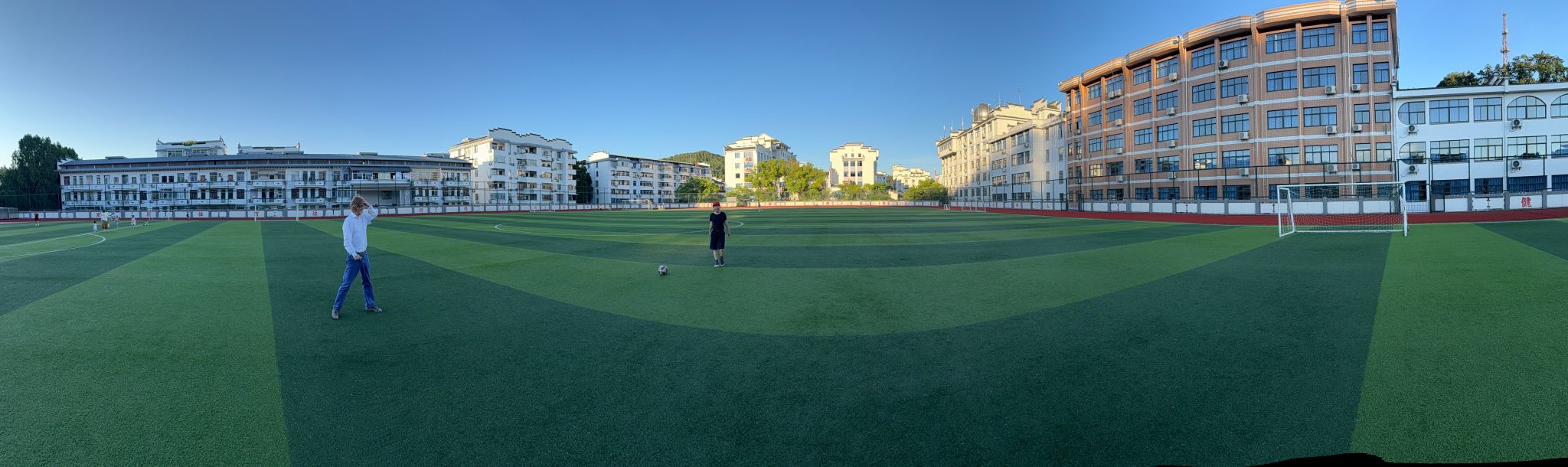 夕阳下Kozinski教授给泰宁一中足球队同学展示球艺Under the sunset, Prof. Kozinski showcases his skills to the soccer team students of Taining No.1 Middle School