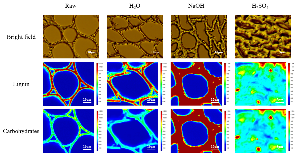 Raman images of the lignin and carbohydrates distribution in the raw corn stover, CSP-H2O, CSP-NaOH, and CSP-H2SO4原始玉米秸秆及其压缩成型CSP-H2O、CSP-NaOH和CSP-H2SO4样品质素与碳水化合物分布的拉曼图像