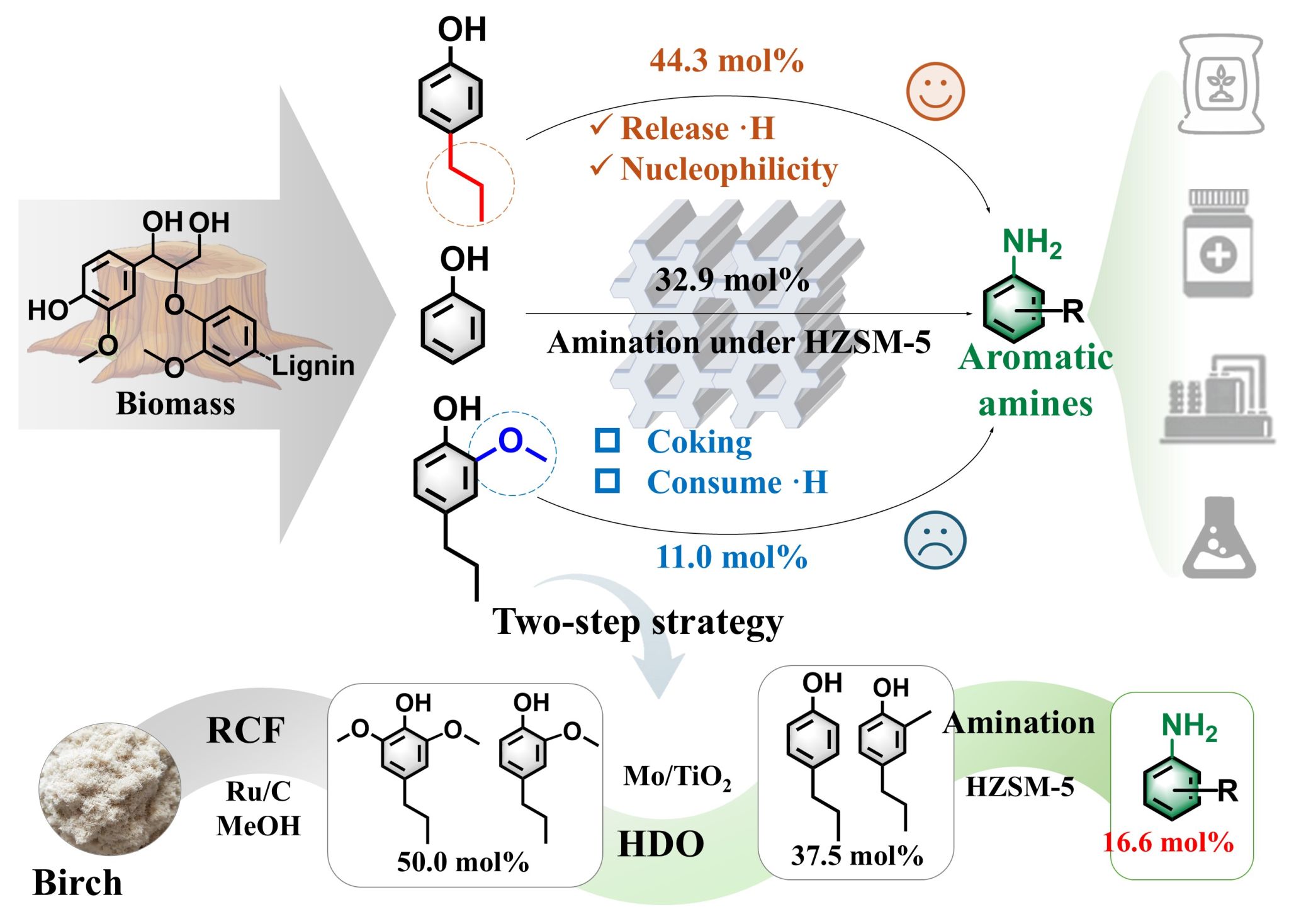 To overcome methoxy inhibition, a Mo-Ga/HZSM-5 catalyst with NH₃-H₂ atmosphere was developed, doubling 4-propylguaiacol yield to 25.9 mol%. A sequential hydrodeoxygenation-amination strategy was further proposed, increasing the yield to 34.1 mol%. Combining this strategy with lignin-first biorefining, birch wood was directly converted to aromatic amines with a yield of 16.6 mol% (lignin basis), higher than previous reports. This work clarifies functional group reactivity rules in lignin valorization and provides a new integrated process for sustainable aromatic amine production from biomass.